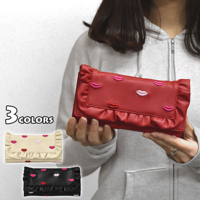 フェイクレザー フリル リップ刺繍 長財布 /レディース フラップ 長サイフ 財布 小銭入れあり 女性 レザー 合成皮革 合皮 かわいい おしゃれ 小物 雑貨 唇 くちびる 口紅 キスマーク フリルリップ刺繍長財布 アイボリー レッド ブラック 黒/ p